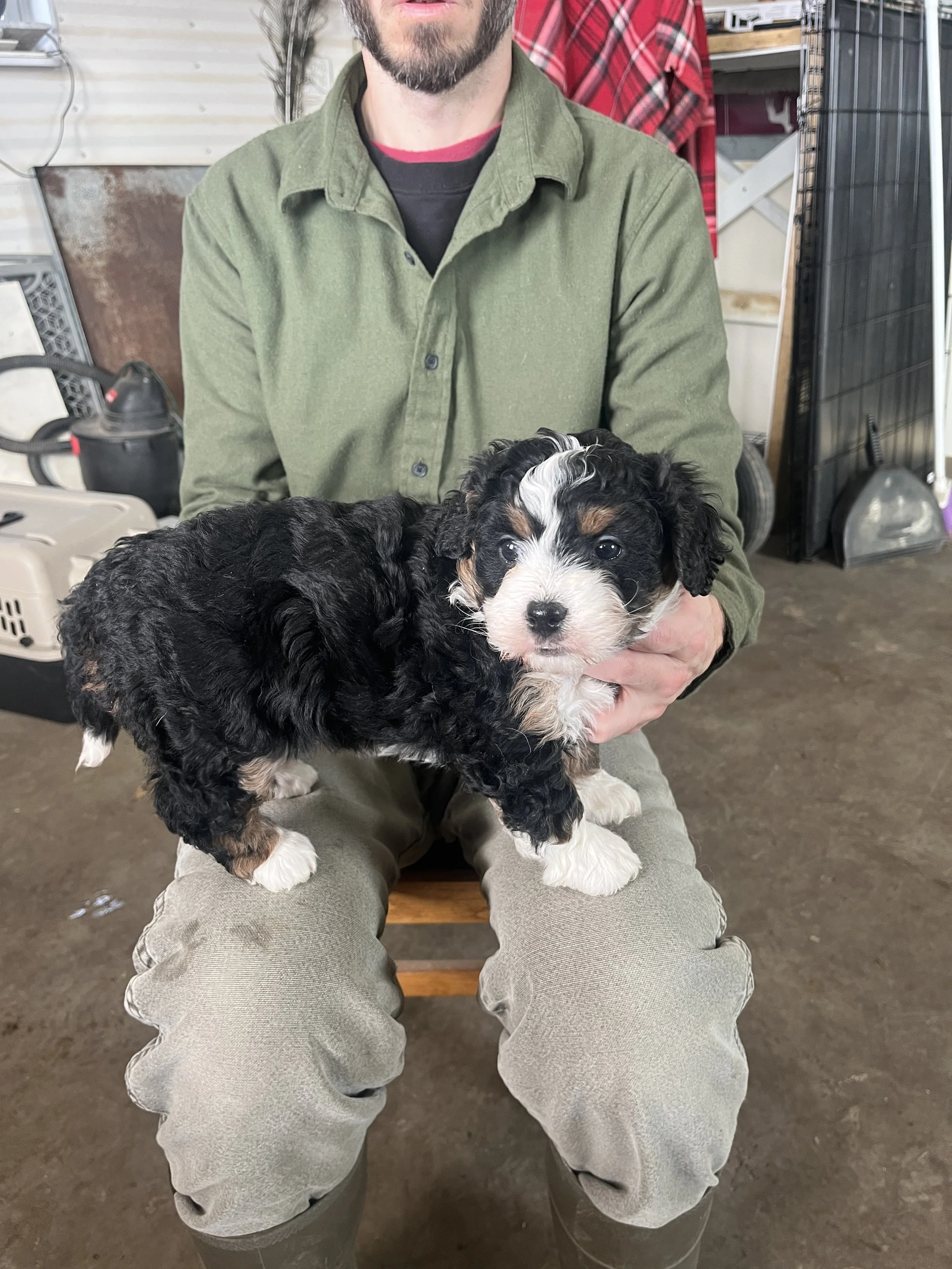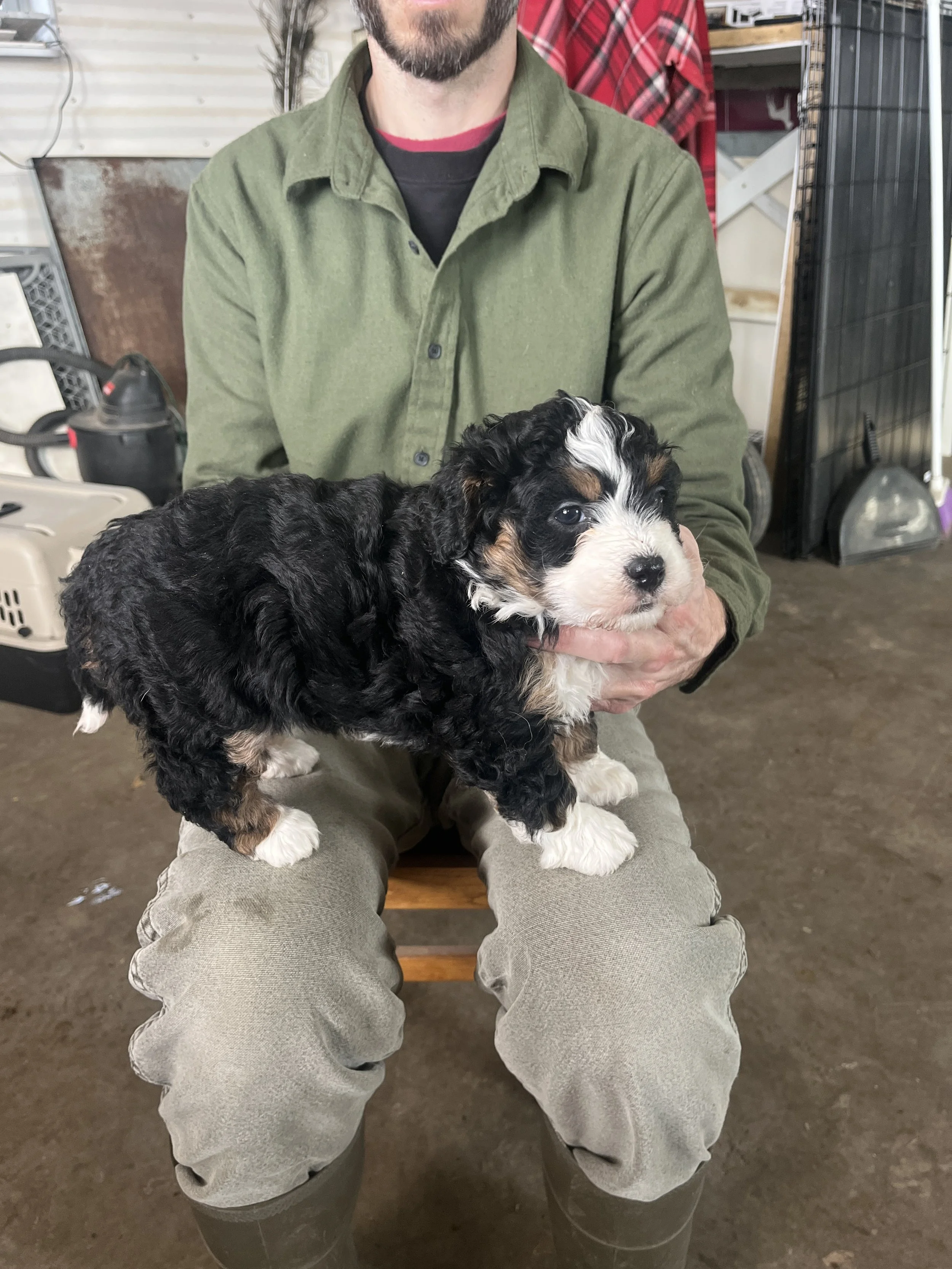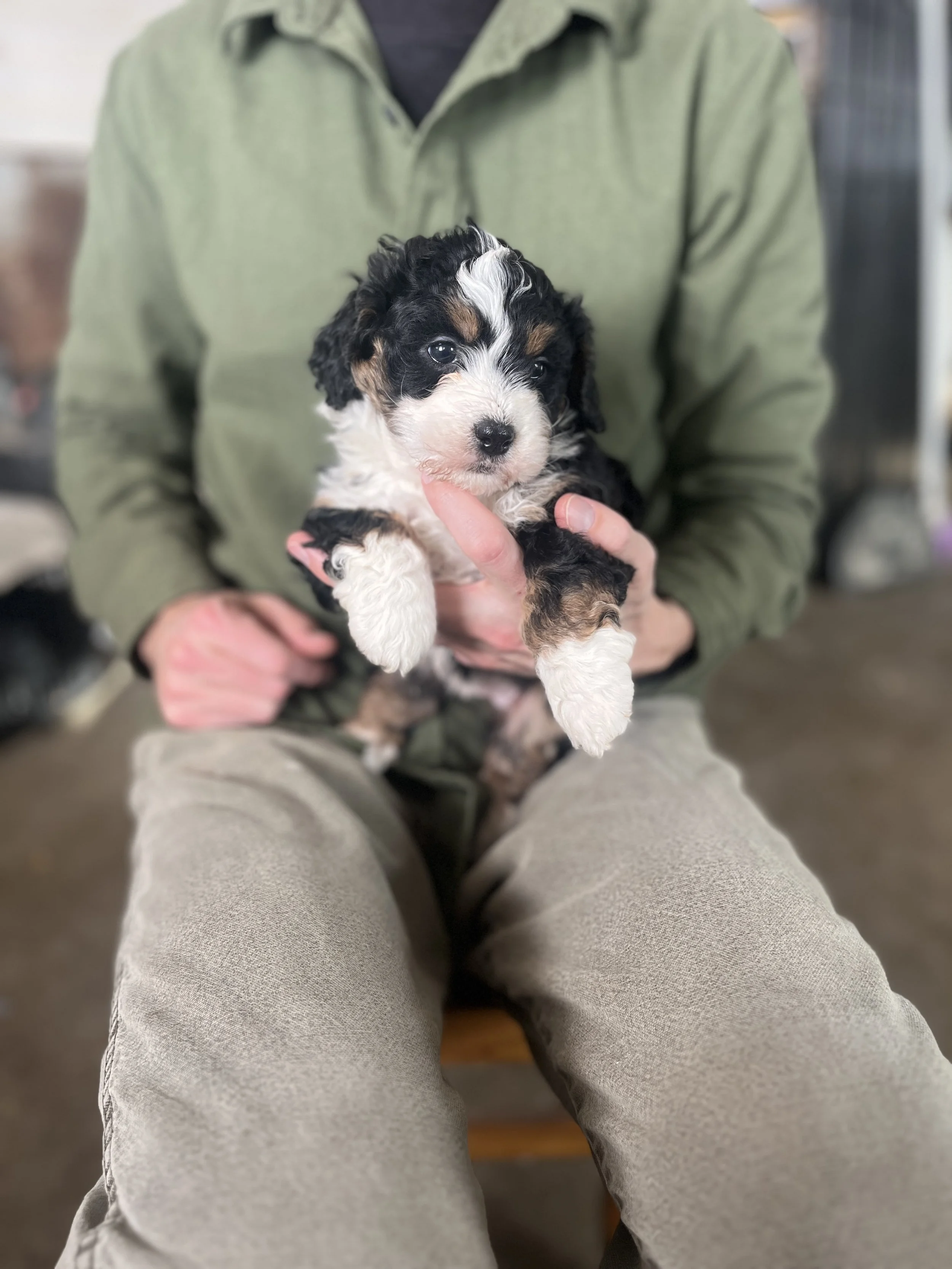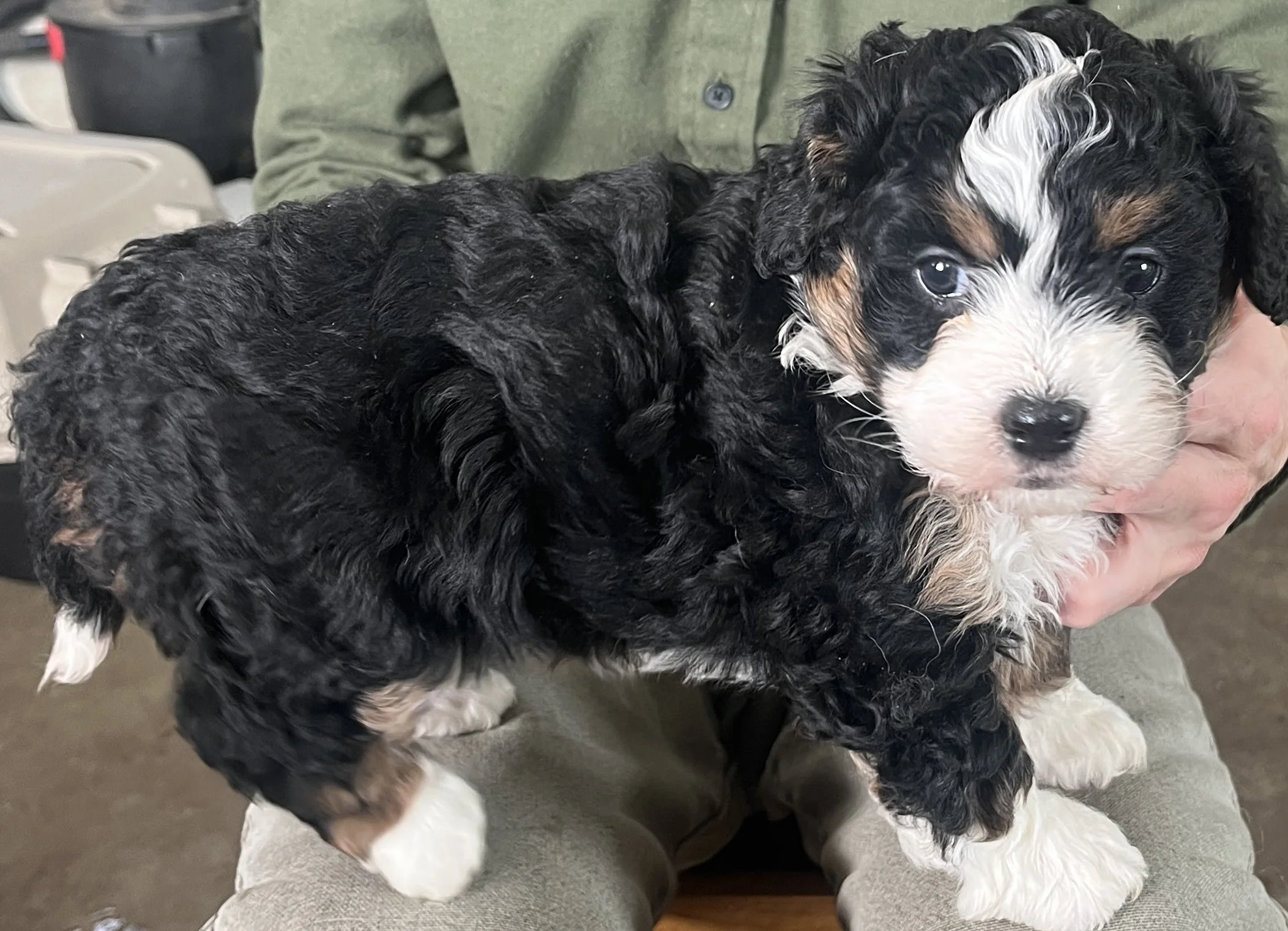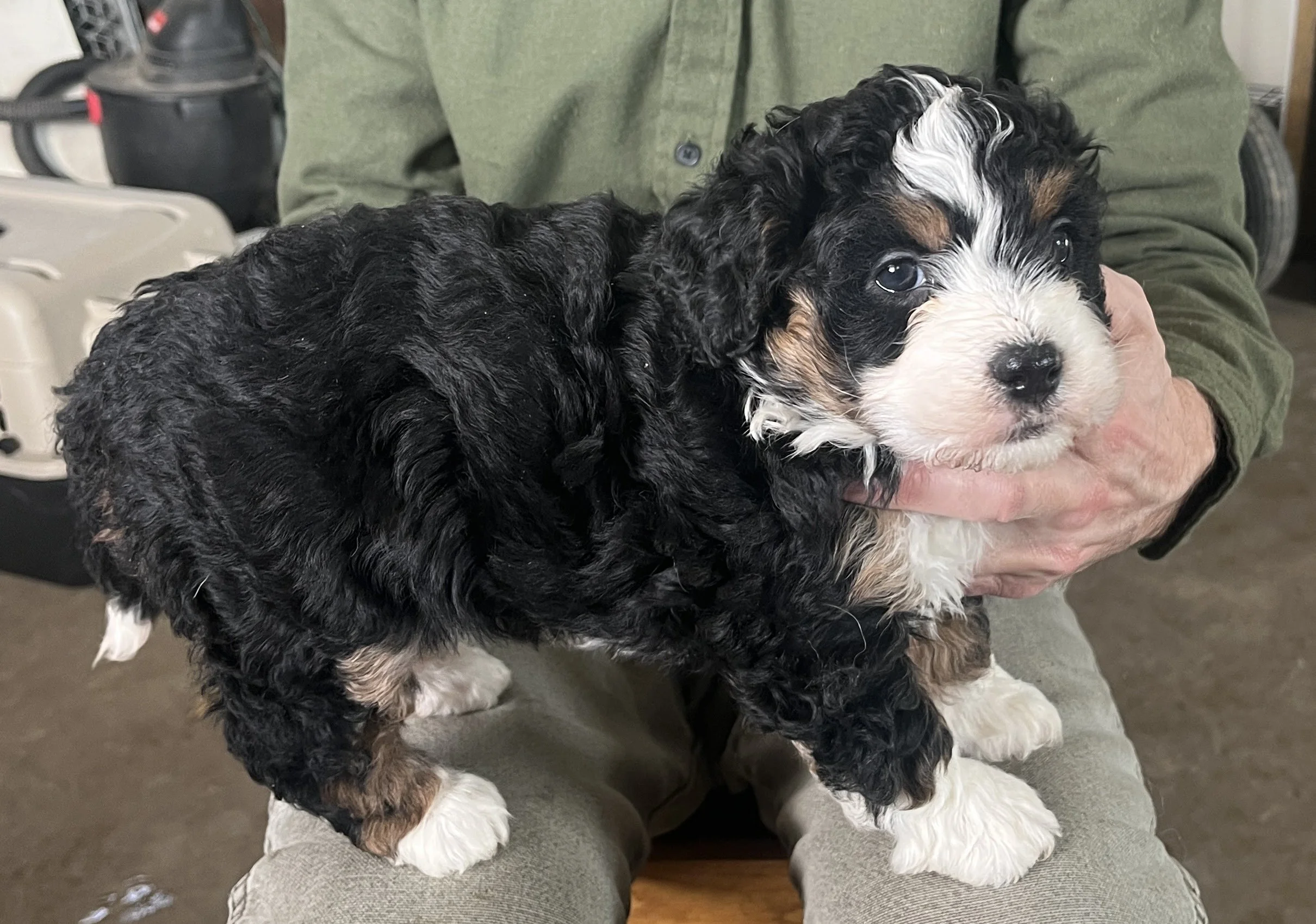 Joy is a Tri-color Miniature Bernedoodle. At full grown, she will likely be between 35 and 50 pounds. Her parents are Harriet and Rugar.